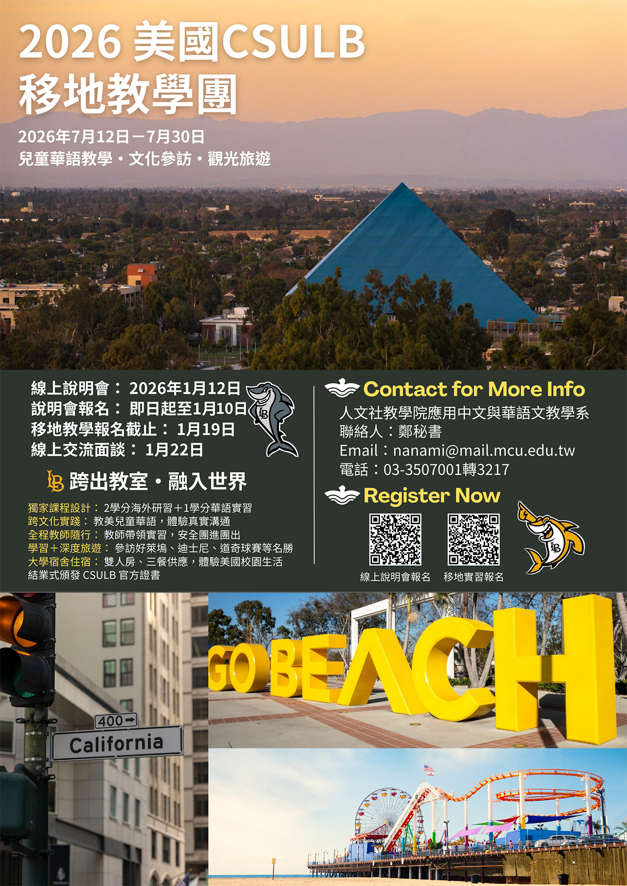 人文社教學院應用中文與華語文教學系「2026美國加州州立大學長堤分校(CSULB)移地華教實習團」,熱烈報名中!