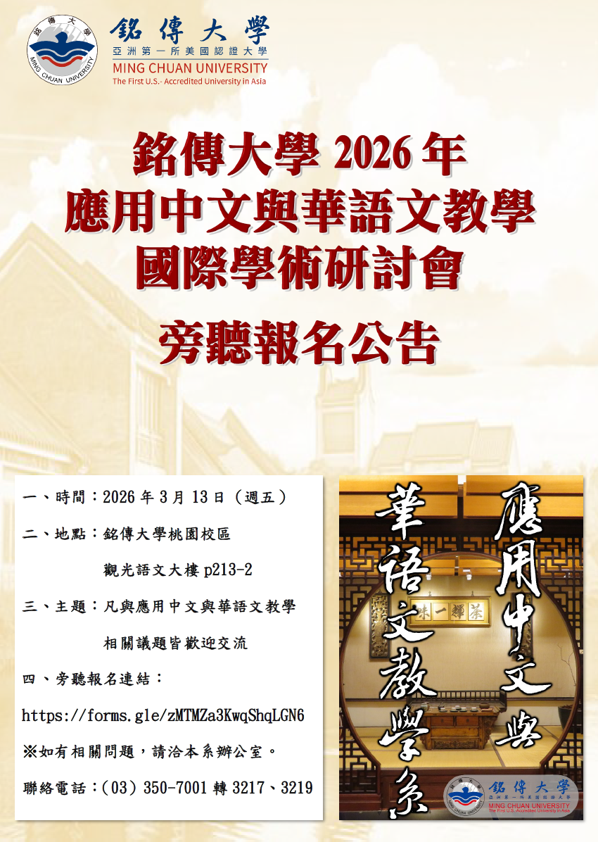 銘傳大學應用中文與華語文教學系將於2026年3月13日(星期五)舉辦「2026年銘傳大學應用中文與華語文教學系 第十八屆研究生學術研討會」,誠摯邀請對相關議題有興趣之師長與同學報名參加。